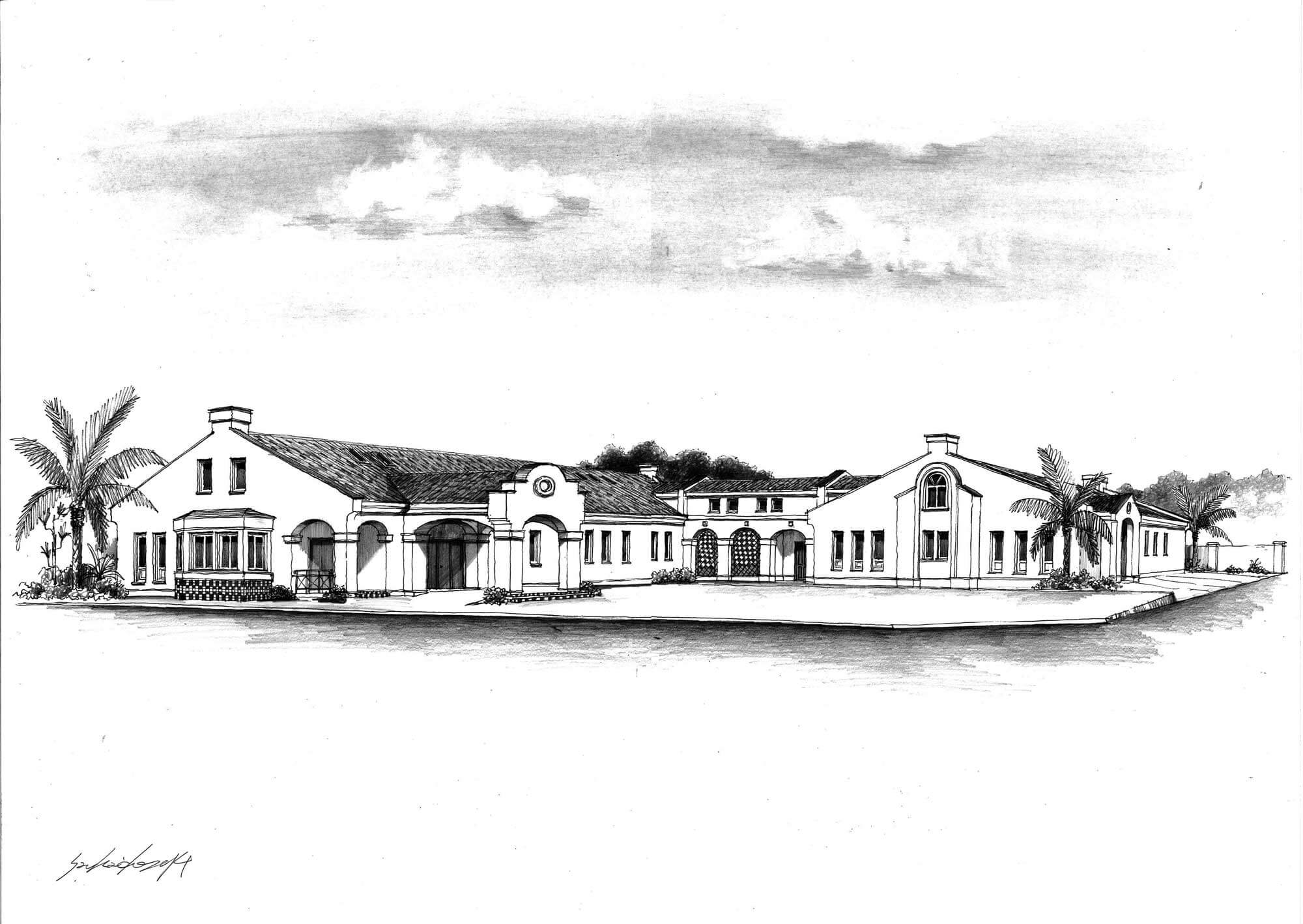 立面の比率、アーチのリズム、屋根勾配のバランスなど、外観の構成原理が端的に示された初期スケッチ。完成形に受け継がれる意匠の骨格が描き出されている。