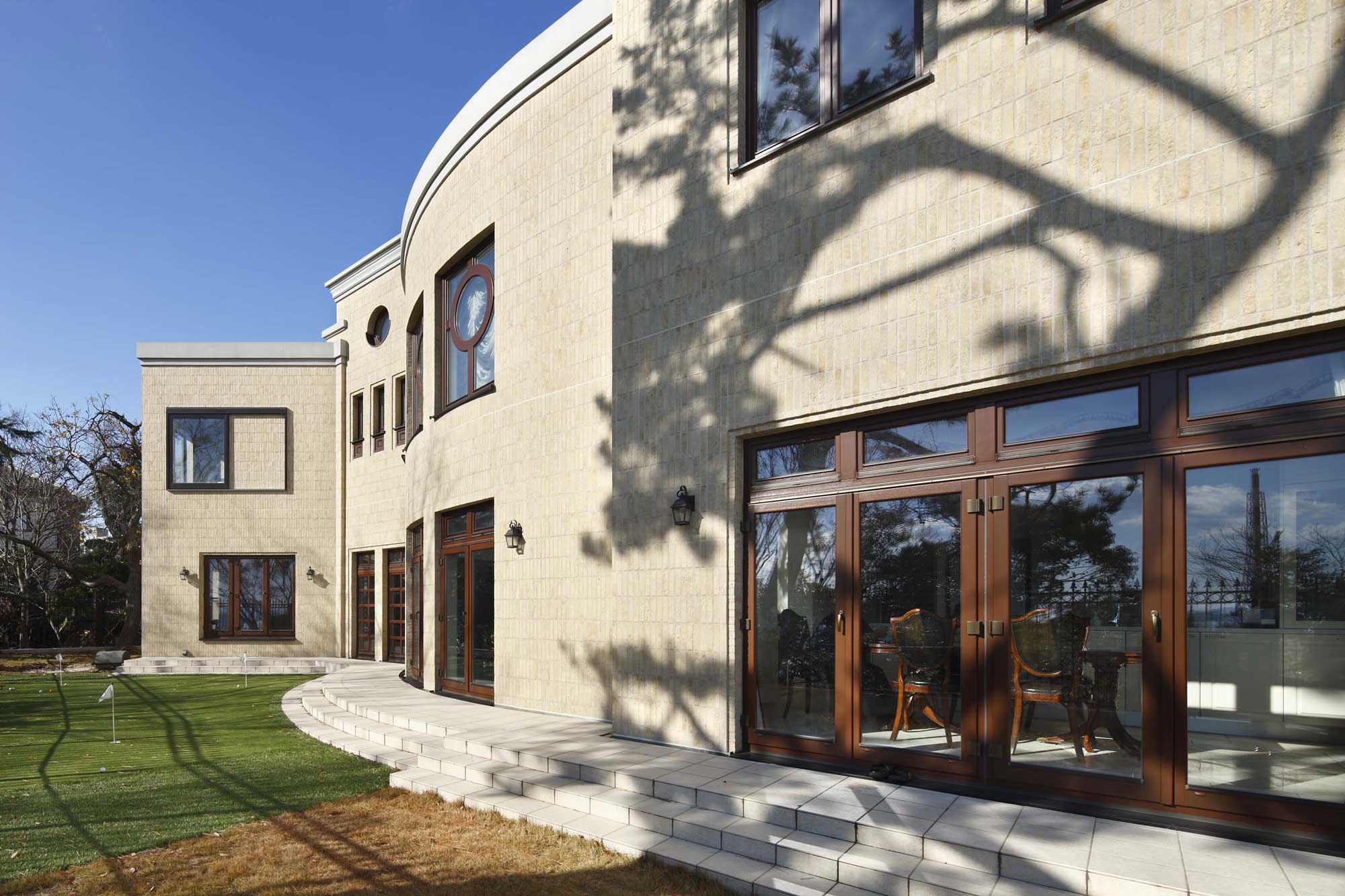 曲面の外壁に落ちる樹影が、立面に時間の移ろいを映し出し、建築の静かな表情を深めている。丸窓と縦長窓の組み合わせが曲線と呼応し、外観に独自のリズムと柔らかいアクセントを与えている。