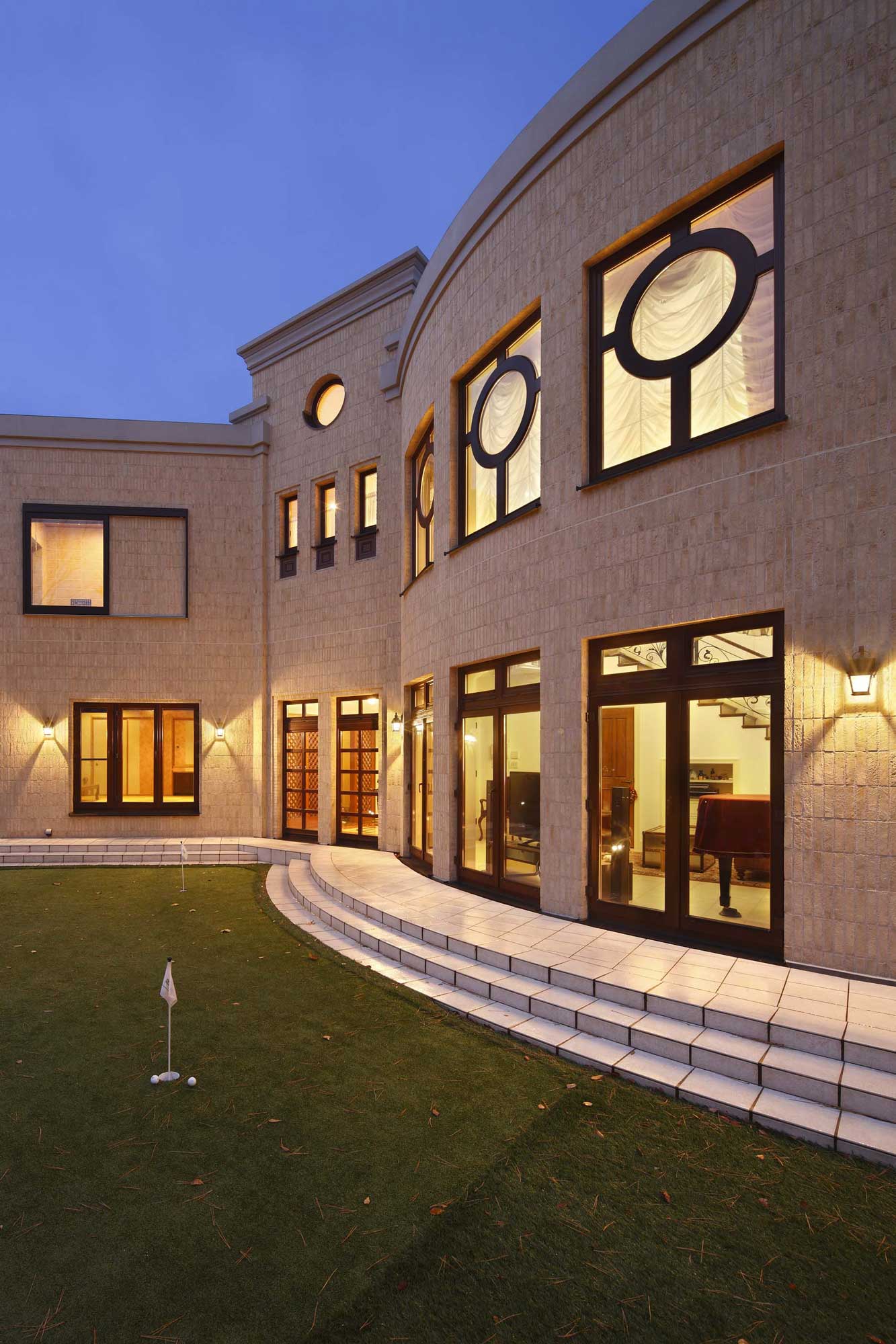 夕景の光が窓の縁を柔らかく照らし、内部の温度が外へ滲むように広がる。曲面の外壁が光を受けて穏やかに反射し、昼間とは異なる落ち着いた存在感が際立つ。建物が“住まいとしての温度”を帯びる瞬間が表現されている。