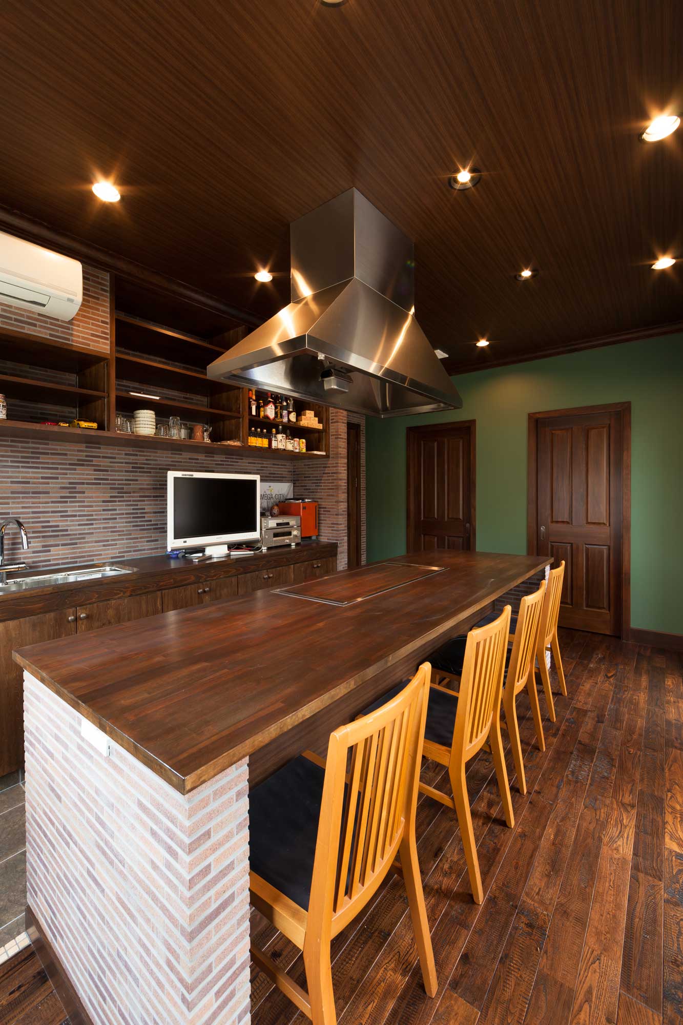 レンガの質感と深いグリーンの壁が空間にブルックリンらしいラフな表情を与え、木のアイランドとステンレスフードが素材の対比を際立たせている。連続する窓からの光が陰影を豊かにし、重厚さと開放感が共存するキッチンが立ち上がっている。