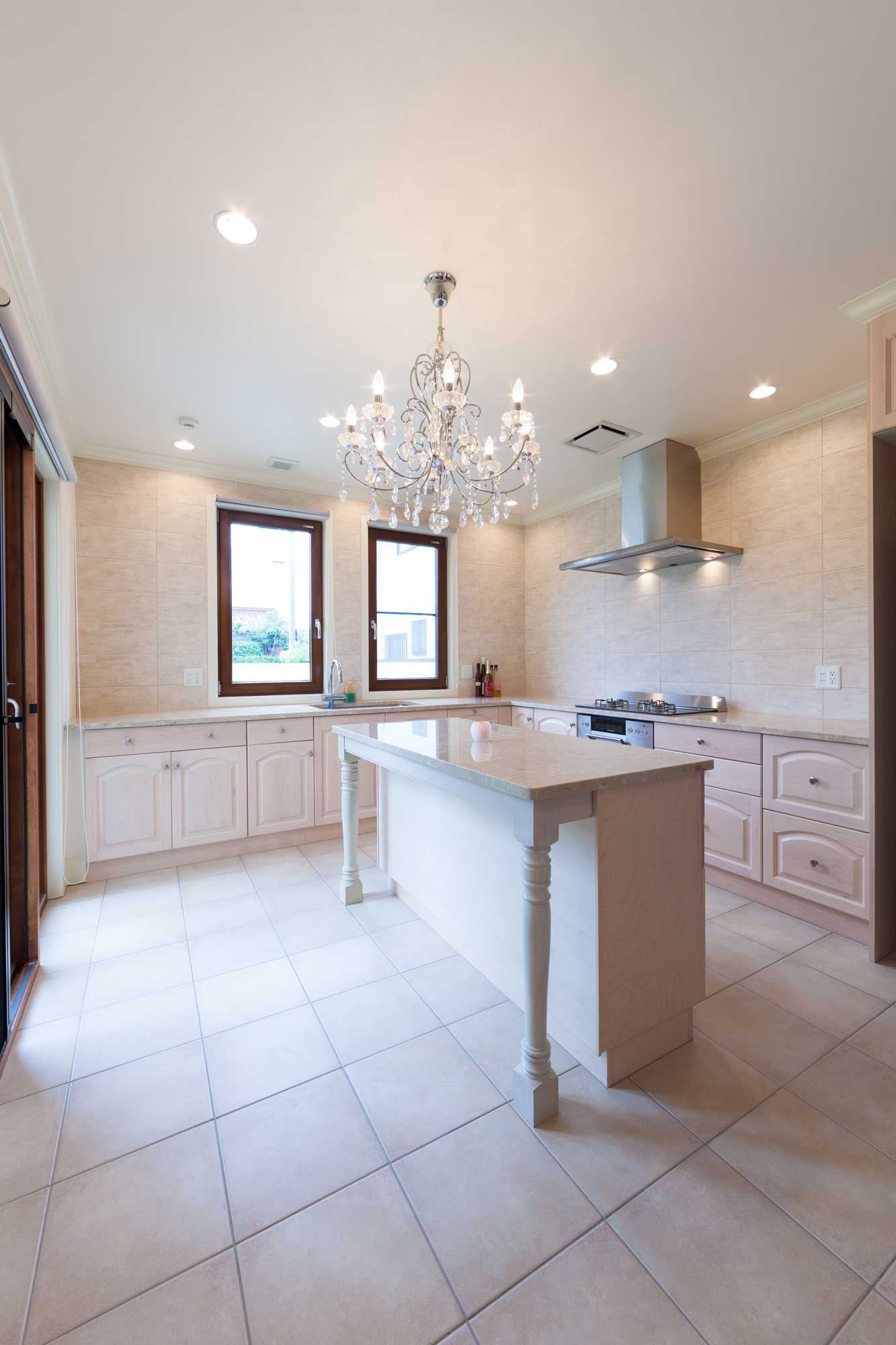 ホワイトとマーブルの上質な素材に、淡いピンクが優雅なフェミニンさを添えるキッチン。自然光がピンクのニュアンスを柔らかく照らし、シャンデリアの輝きがラグジュアリーな雰囲気を引き立てている。清潔感と女性らしいエレガンスが調和した、明るく洗練された空間。
