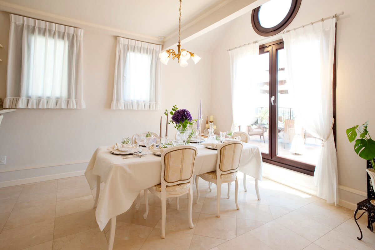 中央のダイニングテーブルや床材に、ふんだんに大理石を取り入れたゴージャスな空間。クラシックなデザインのインテリアで統一された空間は優雅さを感じさせる。