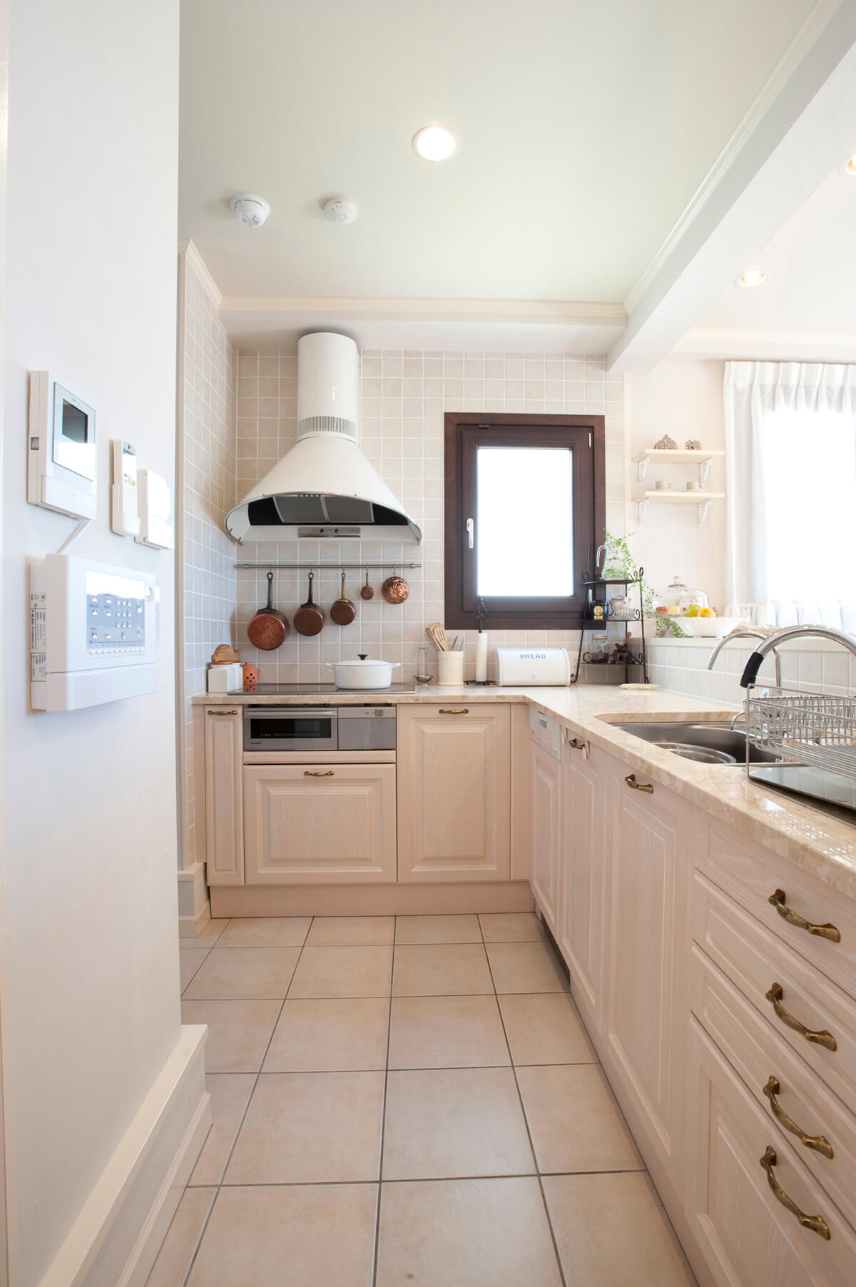 白いキャビネットとタイルがキッチン全体を明るく整え、清潔感のある表情をつくり出している。無駄のない配置とシンプルな動線が機能美を際立たせ、白のトーンがもつ爽やかさと上質さが心地よい空間を形づくっている。