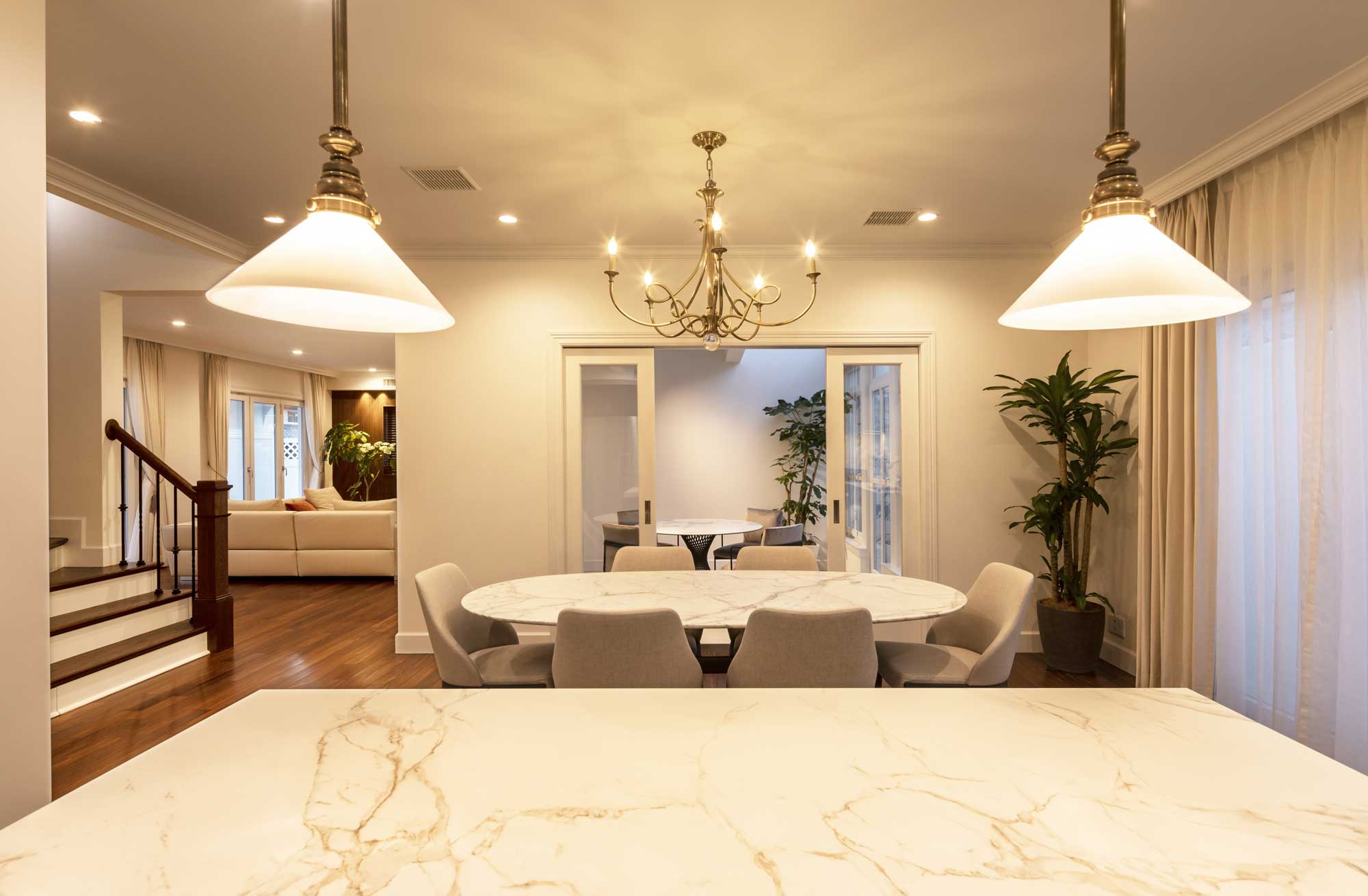 中央のダイニングテーブルや床材に、ふんだんに大理石を取り入れたゴージャスな空間。クラシックなデザインのインテリアで統一された空間は優雅さを感じさせる。