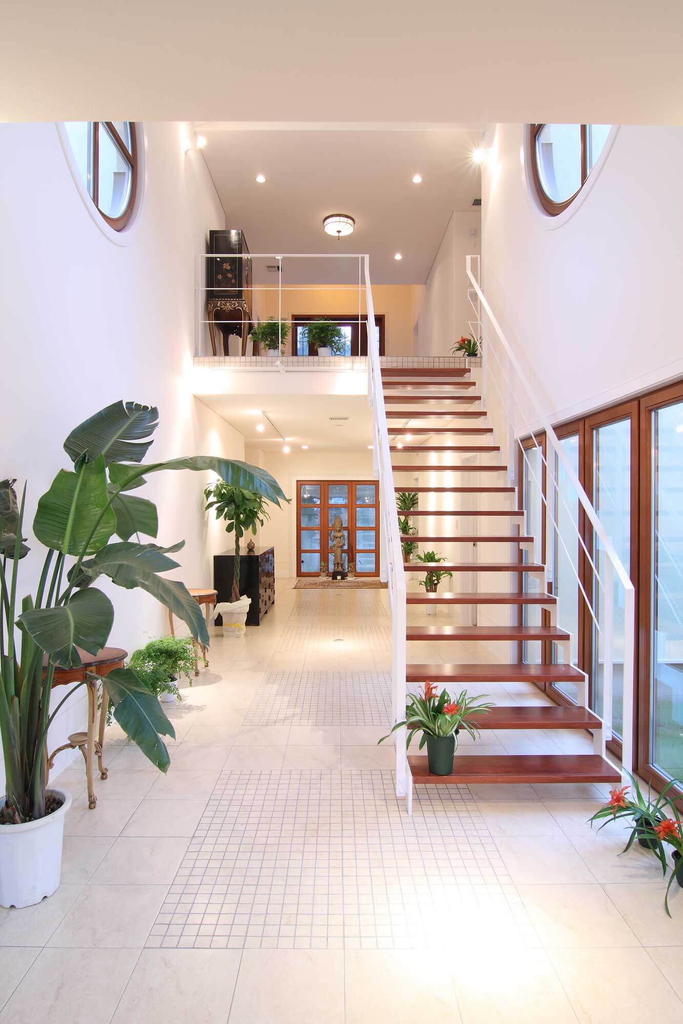 大きな窓から降りそそぐ自然光が階段室を満たし、白と木のコントラストが軽やかな広がりを生むデザイン。随所に配したグリーンが空間に生命感を添え、上下階をつなぐ動線がまるで屋内の庭のような開放感を描き出している。